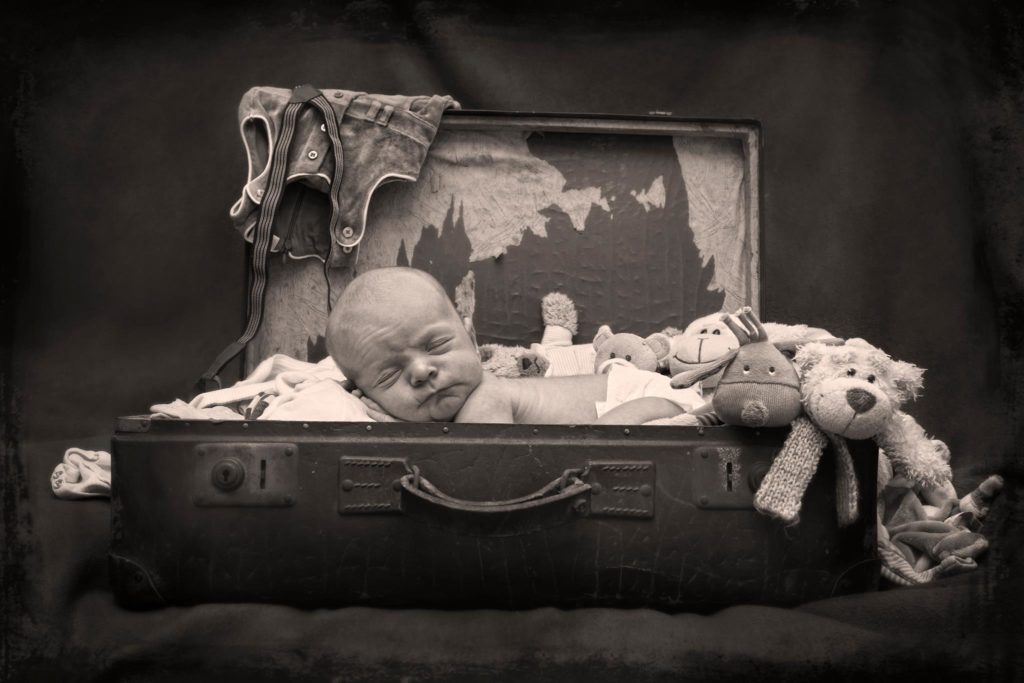 Dieser kleine “Zwerg” hat das Wichtigste schon verstanden. “In der Ruhe liegt die Kraft” Na klar, wenn man beim lässigen Posen im alten Koffer mit den lieblings Kuscheltieren schmusen darf und gleichzeitig von Mama mit dem großen Fön, warme Luft auf den Rücken gepustet bekommt 🙂 Wie könnte man da anders, als ganz lässig dieses Foto zu rocken.